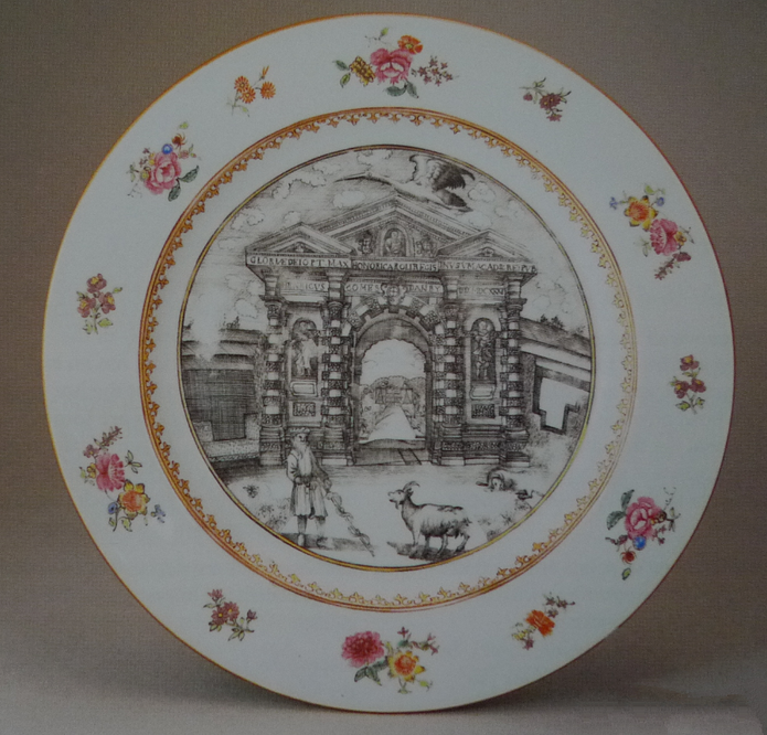 约在1765年,广彩匠师制作过一件描绘英国牛津波塔尼卡尔公园大门的瓷盘,门前站着和山羊一起散步的德国植物学家波巴尔脱。这是荷兰铜版画家伯尔格赫尔斯的作品,由牛津的青年博物学家布莱克带到广州,请广彩匠师复制到瓷盘上。