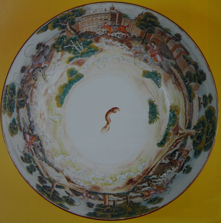 闻名欧洲的广彩文物珍品《猎狐纹调酒大碗》,直径达40.4厘米。碗内壁一圈满画着一幅西洋人猎狐全景图。图中贵族们正策马飞驰,一只跳跃奔跑的狐狸绘在碗底中间,这是模仿一幅油画绘成的。但是图中所采用的环形散点透视法跟中国长卷画的散点透视法是出于一样的原理。由此可见,碗里美丽完满的图案,是广彩的加彩高手经过对原画构图的再创作绘制而成的。