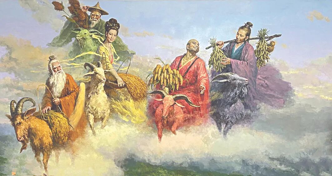 广州“穗城”之名,源自“五羊衔穗”的传说。图为《五羊传说》油画,作者潘嘉俊,现藏于广州博物馆。(广州博物馆供图)