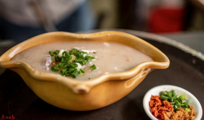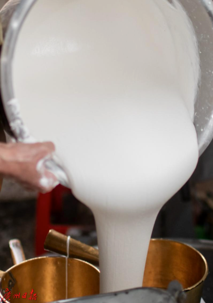 “濑粉是广州最传统、性价比最高的早餐品种之一。它实际上是粥和粉的结合体,由于黏稠度高,也被称为‘嚿(gou,四声)嚿粥’。在湿气较重的岭南,人们早上胃口不佳时,一碗好消化的濑粉可以打开味觉。”