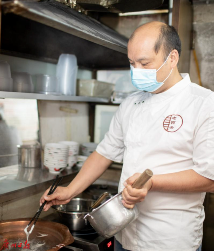 这些年来,伍文辉不断丰富濑粉口味,比如贵州酸汤濑粉、卤水濑粉等,给街坊增添惊喜。“政府很支持我们,给予非遗传承人一定补贴,鼓励我们多多推广西关‘水菱角’非遗技能,也在传播上提供了帮助,让西关地道美食传递到全中国乃至全世界。”他说。