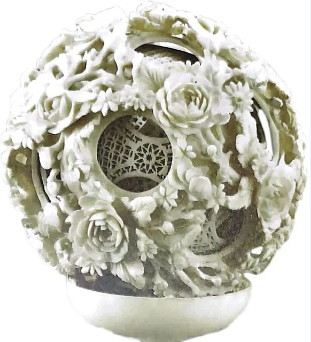 广州镂雕技艺的代表作象牙球,其独特之处是将一块完整的象牙料巧妙地镂空成层层相套的球体,球体精巧剔透,且每层镂空雕刻不同的通透花纹图案,并能转动自如,被誉为“鬼工球”。