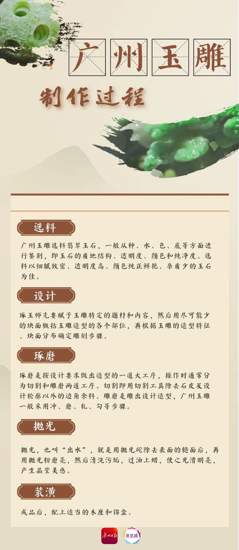 与“北派”玉雕喜用和田玉等软玉雕刻不同,广州玉雕所用材料有翡翠、白玉、碧玉、青玉、岫玉、南方玉等20多种,其中,翡翠玉在广州玉雕中最受欢迎,最能体现广州特色。