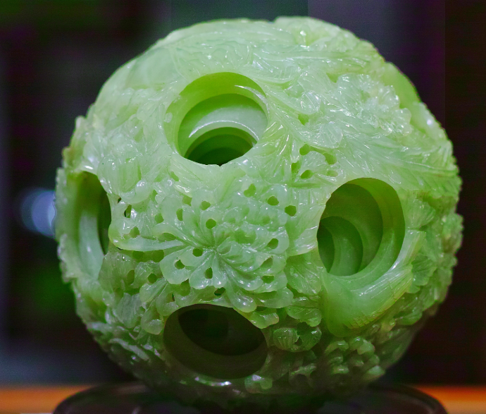多层玉球属于广州玉雕近年来的独创技法,源于广州牙雕“鬼工球”,“鬼工球”即套球,取“鬼斧神工”之意。