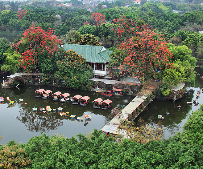 到了唐代,时任广州节度使卢钧再次扩建了菊湖。菊湖建成后,卢钧还在环湖的四周开辟了能跑马车的阔道;在湖的堤岸上广种红棉、刺桐及奇异花草,远望一片殷红。