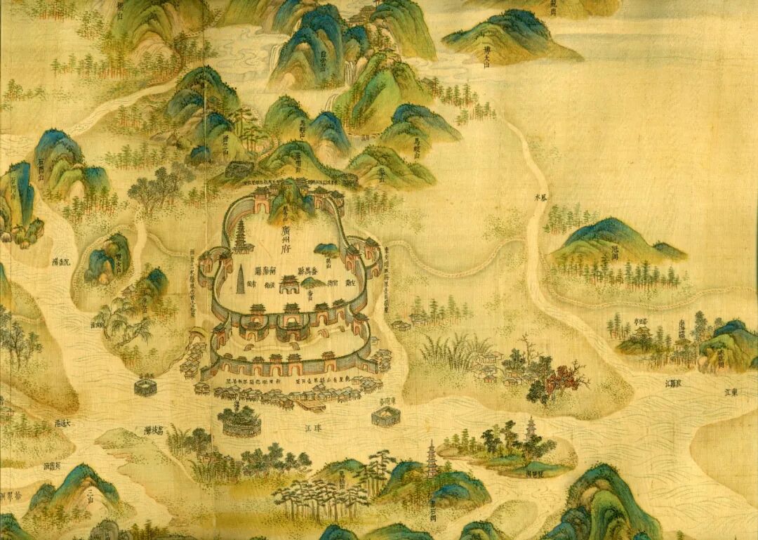 广州府舆图:康熙年间绘制,图上可见南海神庙、浴日亭、波罗江。