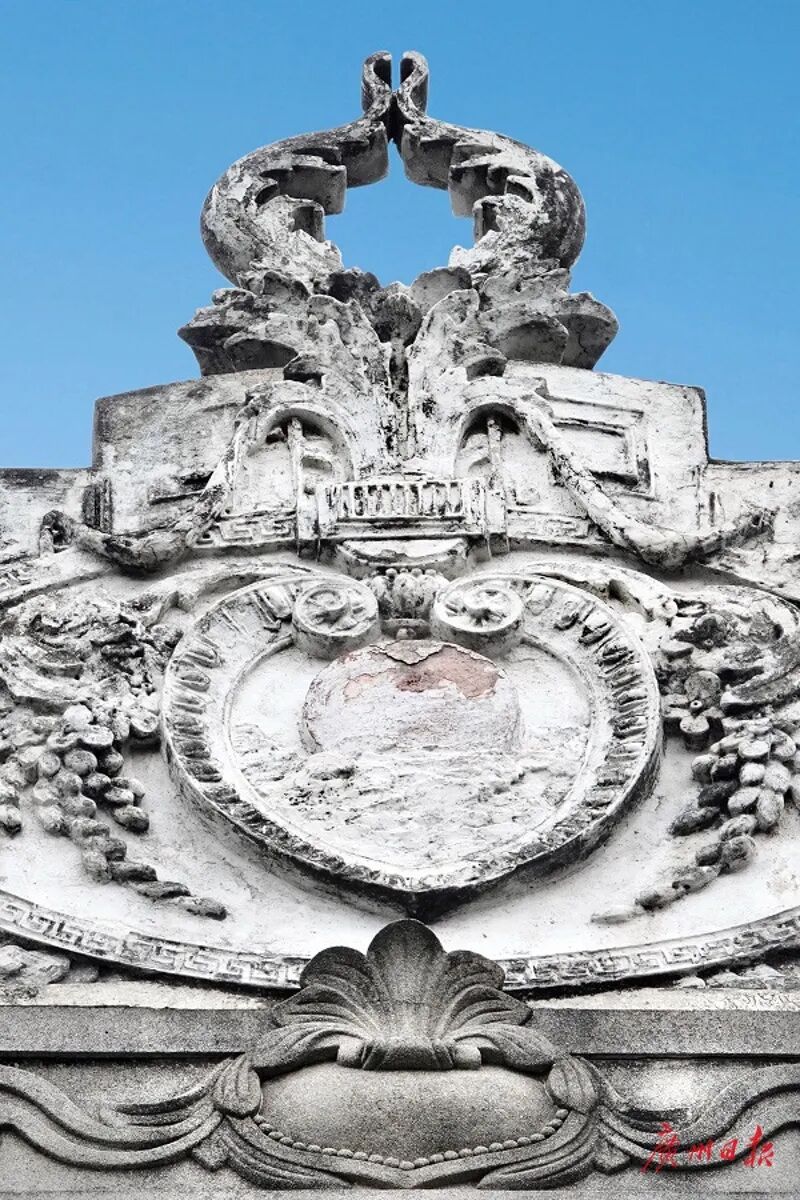 广州恩宁路的一栋骑楼屋檐上以“羊”为元素的石雕装饰。(资料图片)