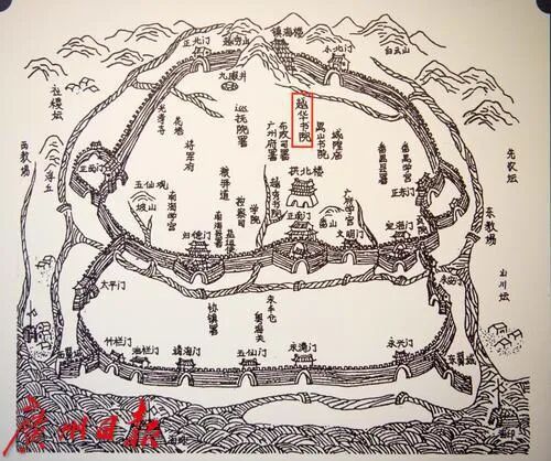 清朝乾隆年间广州城郭图,红圈处为越华书院。