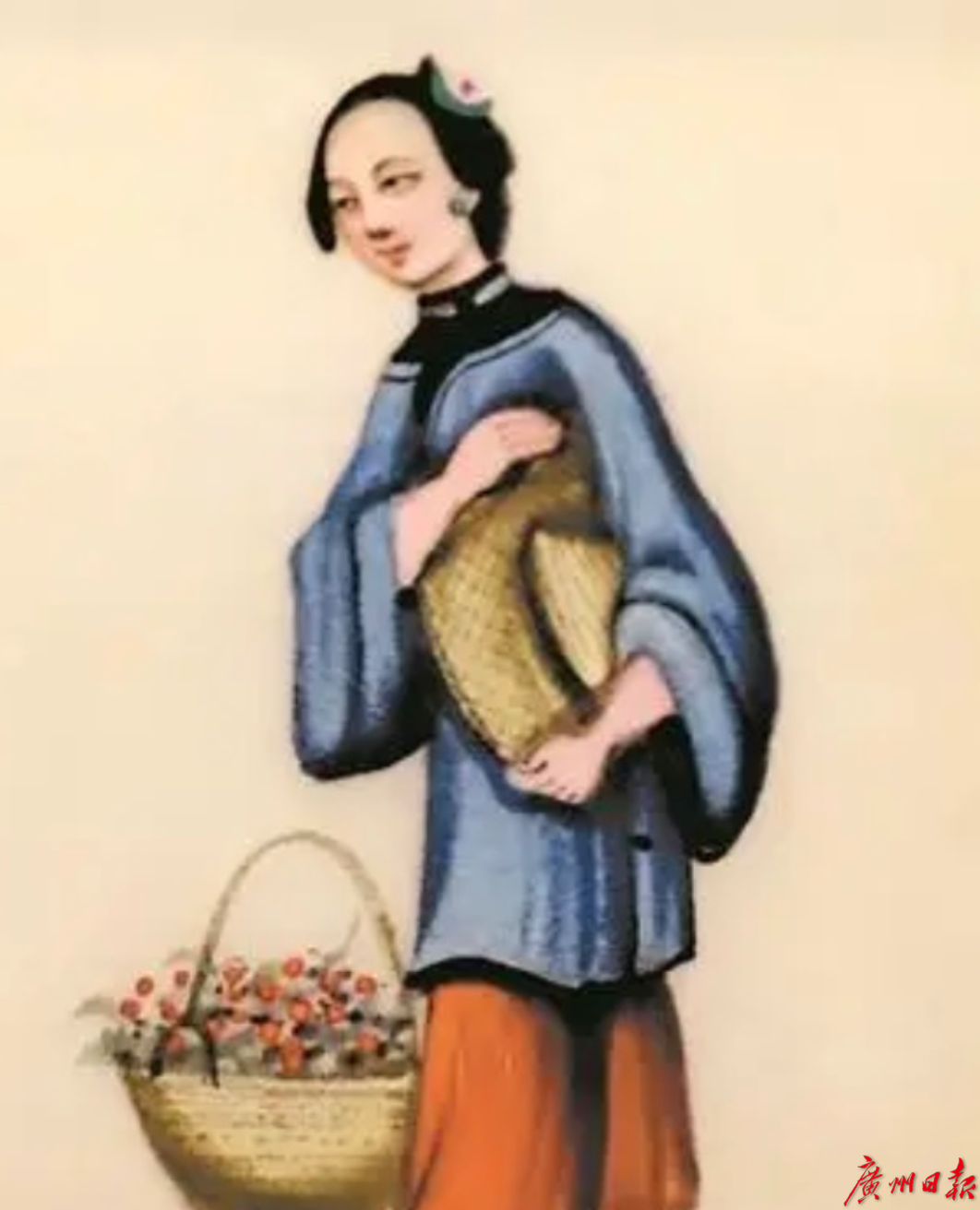这幅清代外销画描绘了清代小贩走街串巷,贩卖蔬菜花卉的场景。