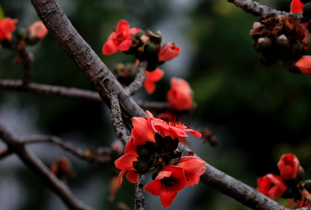 广州街头,红红的木棉花挂满枝头,为花城的初春带来点点的喜庆和暖意 骆昌威 摄