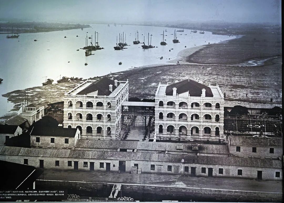 1906年,时任两广总督岑春煊筹建广东士敏土厂,“士敏土”即水泥的英文单词“cement”粤语音译。士敏土厂由高耸的烟囱、西式厂房和西式外廊式建筑组成。一条用石块砌筑堤岸的运河从江畔一直延伸入厂内。以运河为界,厂区分为东西两个部分,西侧生产水泥,东侧生产硬红砖和花阶砖,分别称为西、东厂。