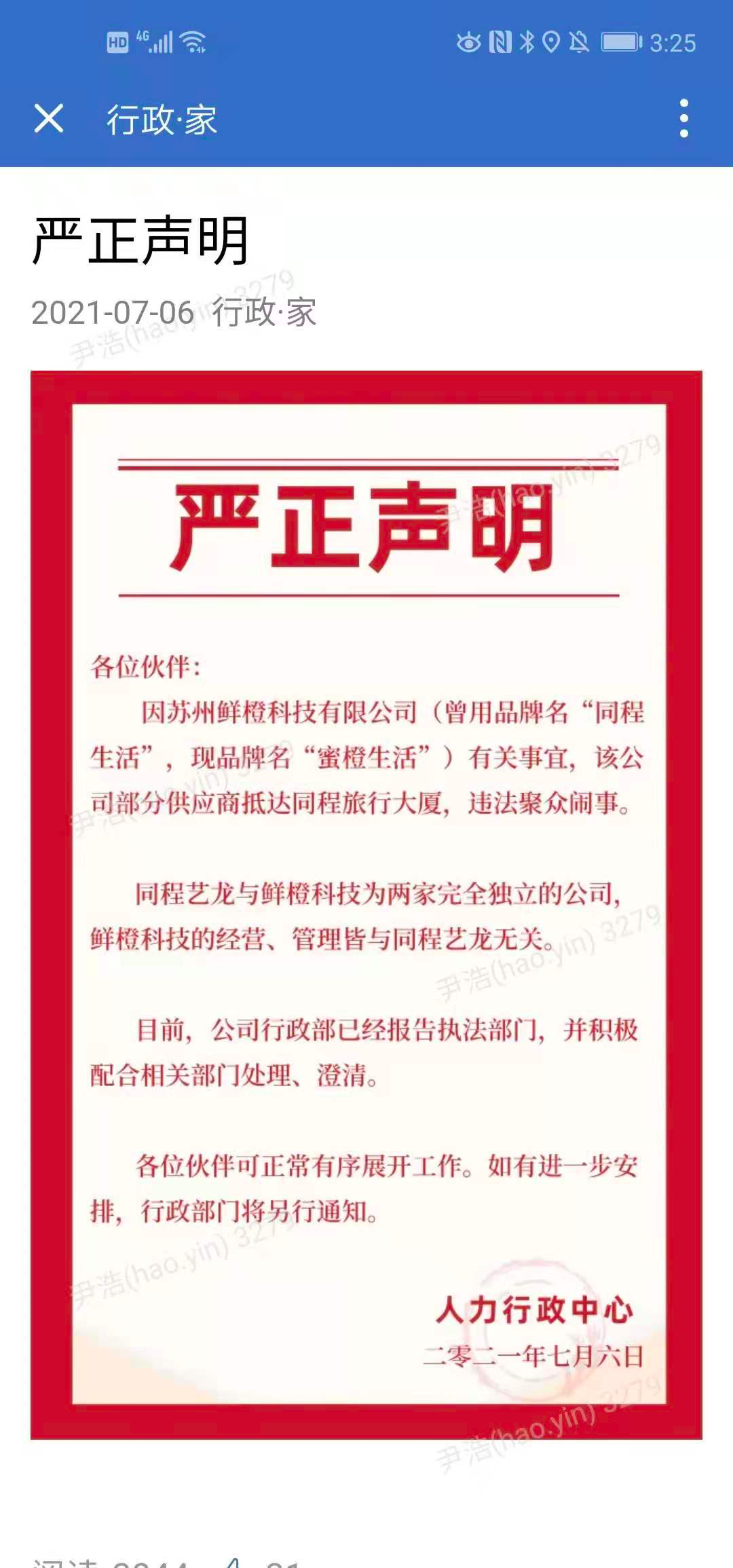 7月6日下午,同程艺龙人力行政中心更是发布声明,“同程艺龙与鲜橙科技是两家完全独立的公司,鲜橙科技的经营、管理皆与同程艺龙无关。”