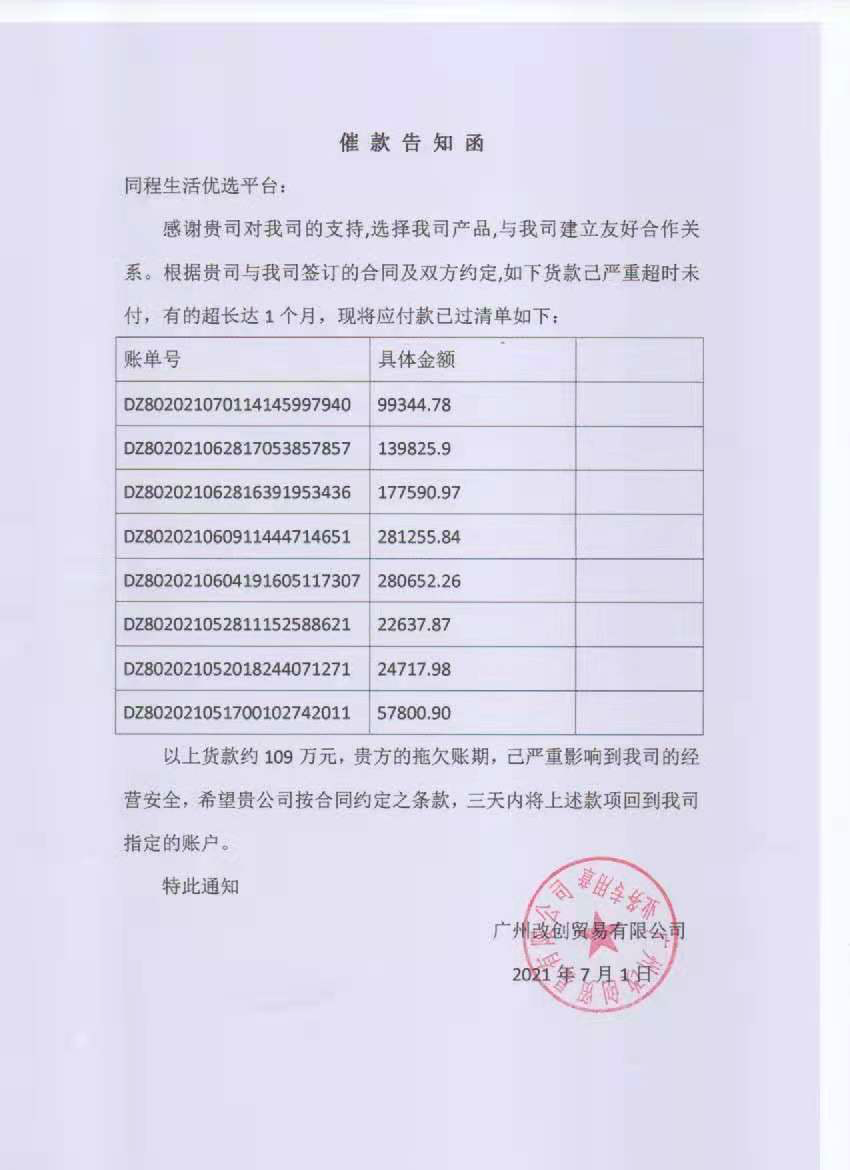 但同程生活对外保证货款不会有问题,并表示会有新一轮的融资进来。再加上6月疫情加大了同程生活的采购量,供应商们也就相信了平台会妥善处理货款的问题。
