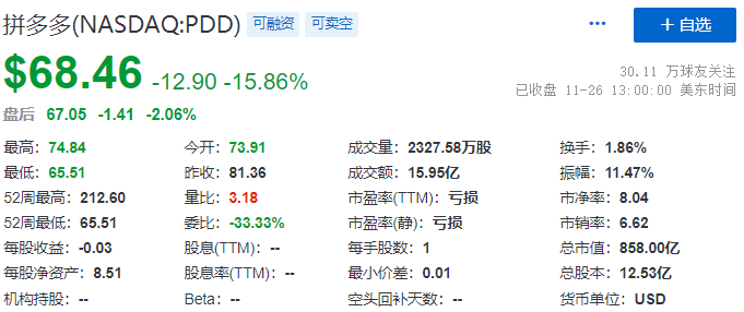 但美股开盘,受到这个“良好数据”的影响,拼多多超低开,之后跌幅一路下探到接近20%的位置,截至收盘跌幅15.86%。一夜之间,161.6亿美元(约合人民币1034亿元)蒸发了。