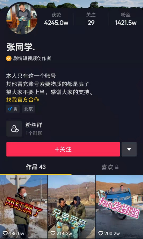 冲着这个人设演绎,10月4日,张同学的第一个视频上线,到了12月7日,张同学总共发了43个视频,累计粉丝1421万。