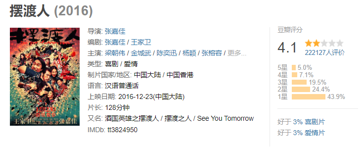 这年末,由阿里影业等联合出品,王家卫监制,梁朝伟、金城武、陈奕迅、Angelababy等领衔主演,柳岩、鹿晗等参演的贺岁片《摆渡人》上映,猫眼、豆瓣口碑极差。