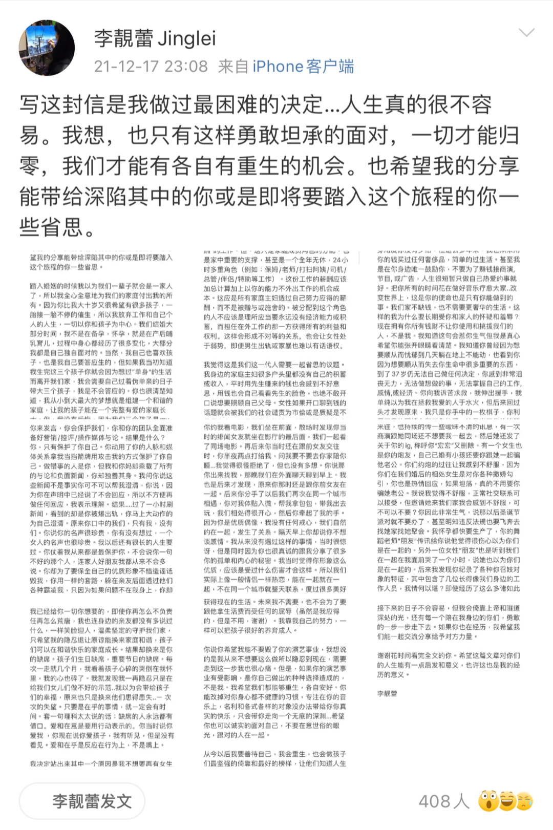控诉文信息量很大。除了控诉王力宏约炮、召妓、出轨之外,还包括不停地催生孩子,连同家人羞辱和冷暴力。总之,超出了我们对王力宏既有人设的全部认知。