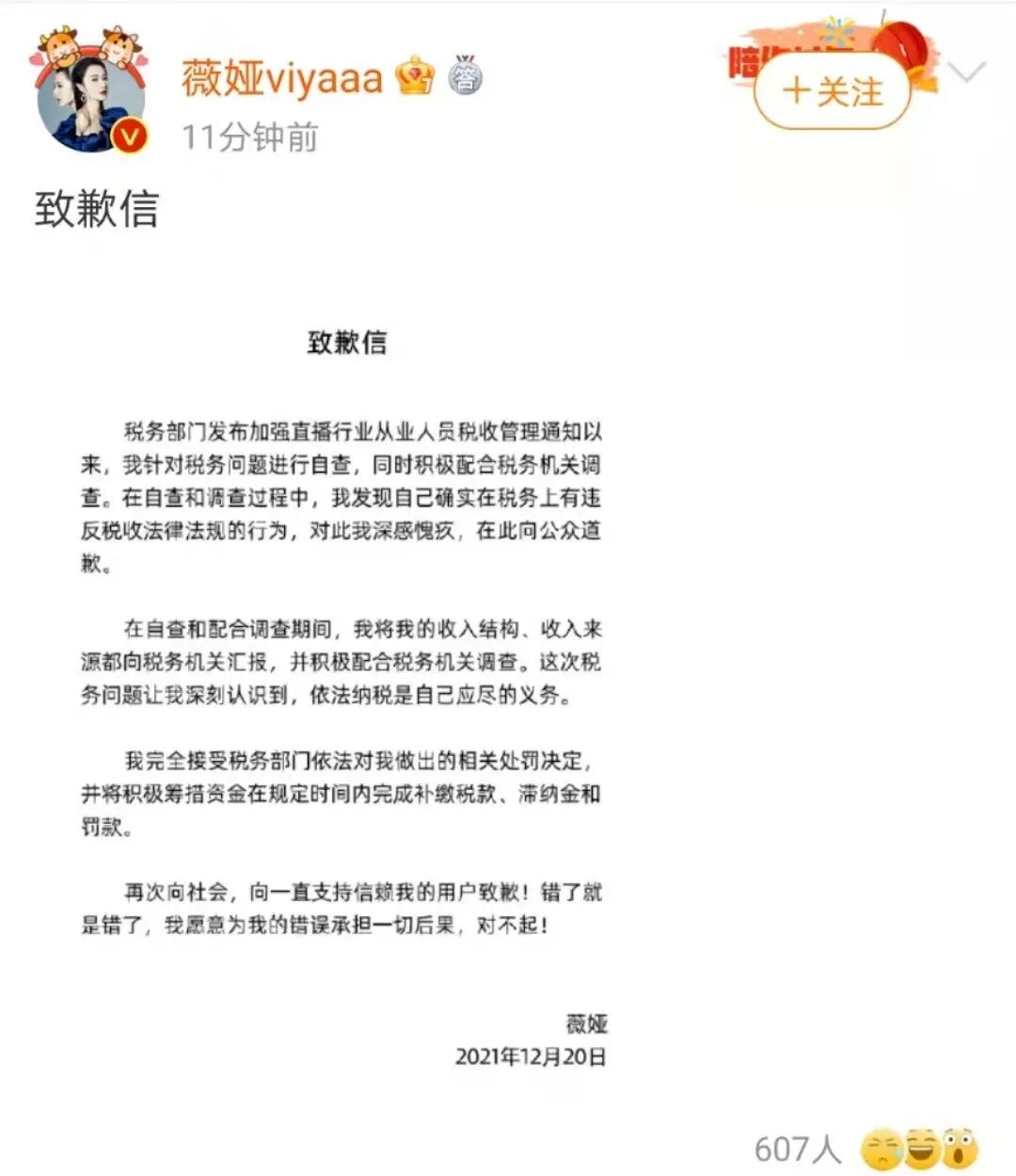 当天,薇娅在道歉信中表示,正在积极筹措资金,希望在规定时间内完成补缴税款、滞纳金和罚款。