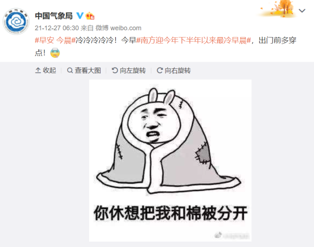 2021年最后一周的周一早上,中国气象局发布了一条微博:南方迎今年下半年以来最冷早晨。