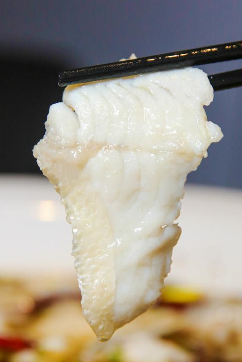 比如选用的鲈鱼,片鱼都有讲究,厚度维持在0.2CM,长度控制在7CM左右。并且选用鲈鱼肉质细嫩的背部,去骨去尾去鱼腩,以确保肉质弹韧爽滑。