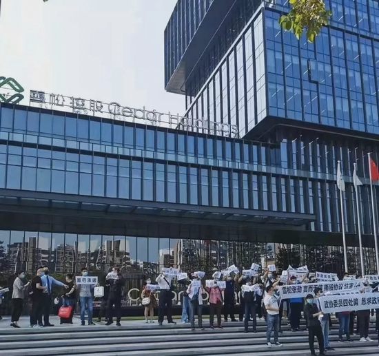 2月10日,雪松控股广州总部楼下聚集了大批兑付无果的投资者,他们只能干守在门口进行维权。