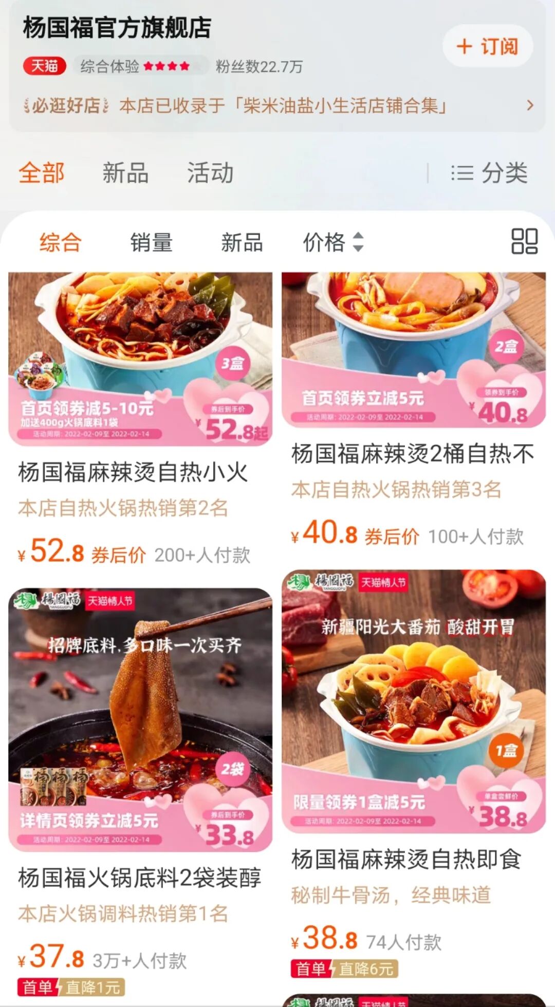 另一方面,作为新入局者,杨国福自热食品的销量可谓“一般般”。伯虎财经发现,杨国福的天猫官方旗舰店自2021年1月上线至今,除了一款火锅底料月销有2万+,一款自热食品月销有3000+,其他产品的月销量都在300以下。比起“同行们”亮眼的数据,杨国福的自热食品要“黯淡”得多。