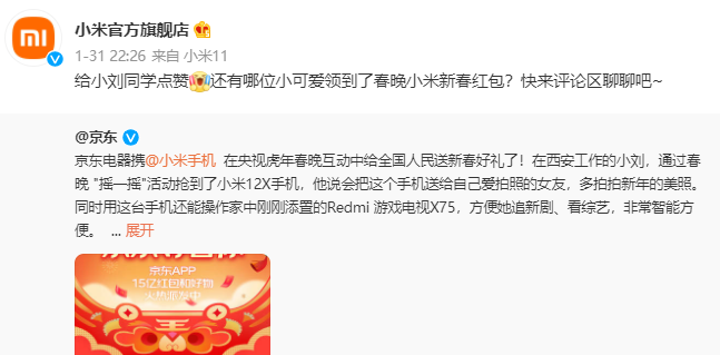一个是在春晚当天,增加发红包的轮次。此前,快手10亿(现金红包)发了4轮,百度9亿(现金红包)发4轮,这次京东的15亿(红包加实物)发了7轮。这样做的好处可能就是“泄洪”。