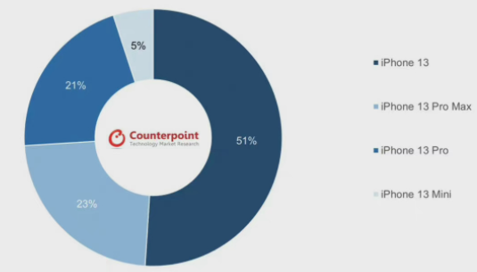 据市场调研机构Counterpoint Research数据,2021年第四季度,5.4英寸的iPhone13 mini版仅占其总销量的5%,相比之下,6.1英寸的iPhone 13贡献了51%。