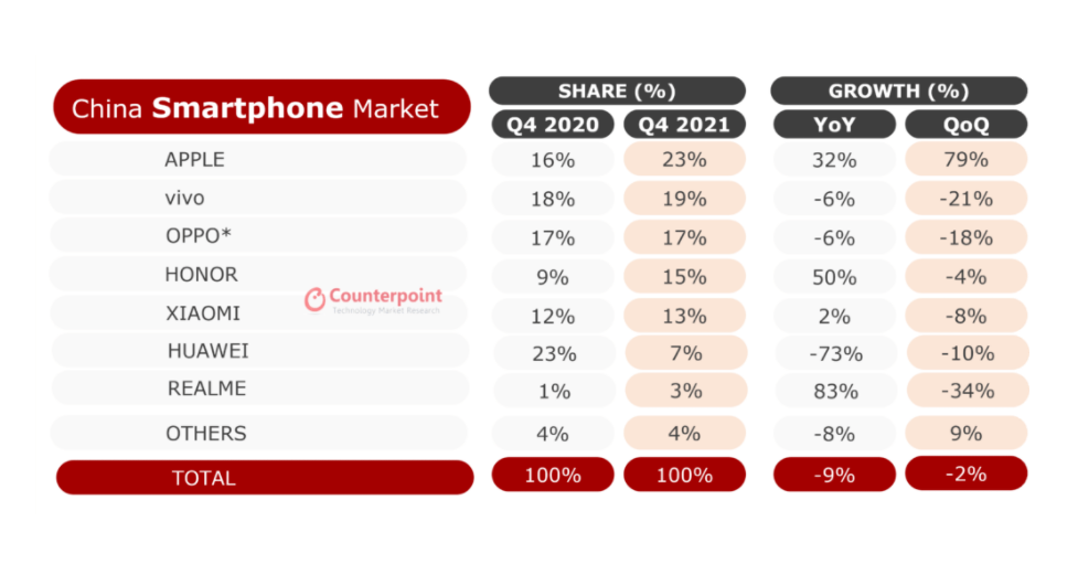 2021年秋季,苹果发布iPhone 13系列后,第四季度,苹果以23%的市场份额,六年来首次登顶中国智能手机市场。