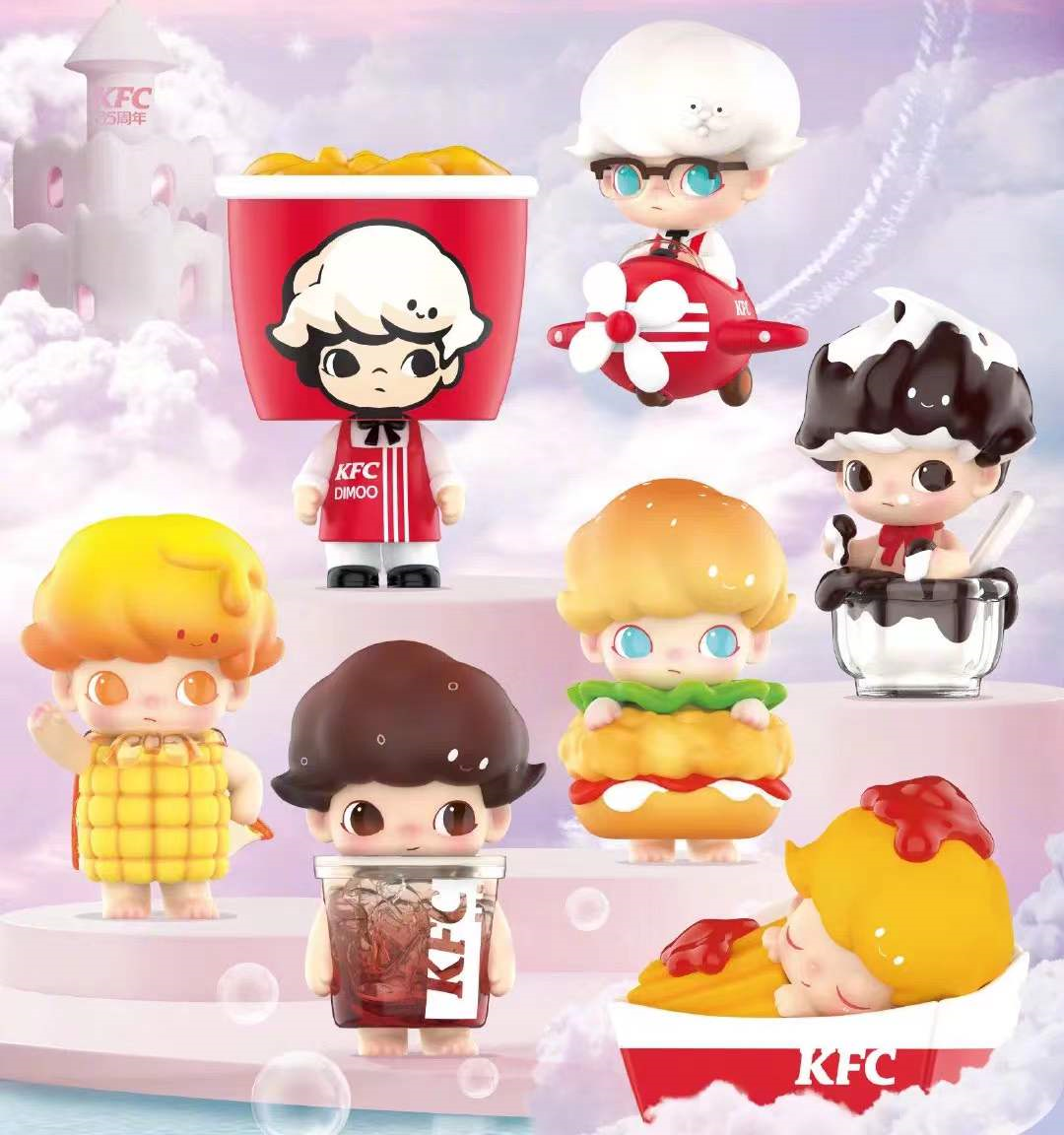 中消协提及的“DIMOO联名款盲盒套餐”,今年1月4日刚刚推出就引起了盲盒玩家们的疯狂抢购。它将肯德基的圣代、薯条、可乐等美食元素和DIMOO的人物形象结合在一起,共有6个常规款和1个隐藏款。