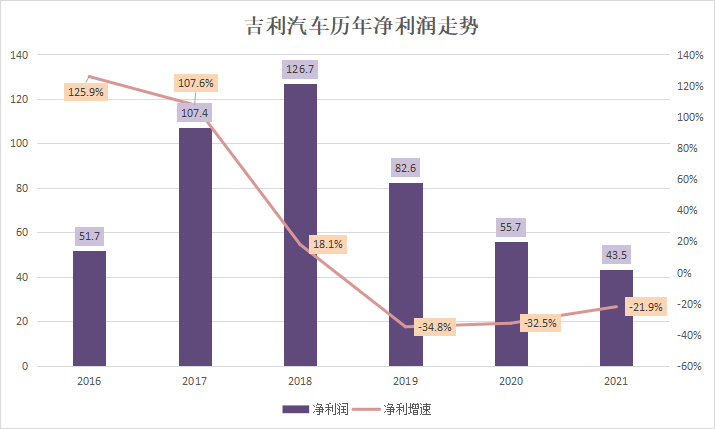 过去3年,吉利汽车的净利润已经连续三年大幅度下滑,从最高的126.7亿到了去年的43.5亿。2021年一年的降幅就达到21.9%。