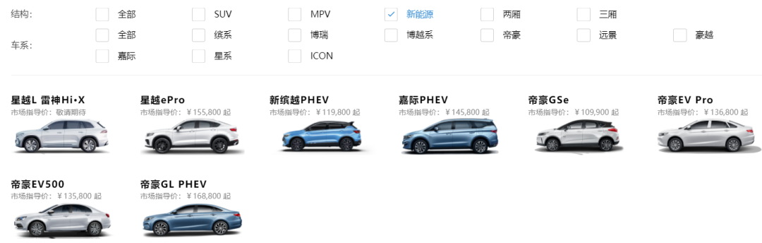 只不过吉利汽车品牌的新能源车型很少,官网在售的29款车型中,只有8款属于新能源车,严重拉低了吉利汽车的新能源车占比。