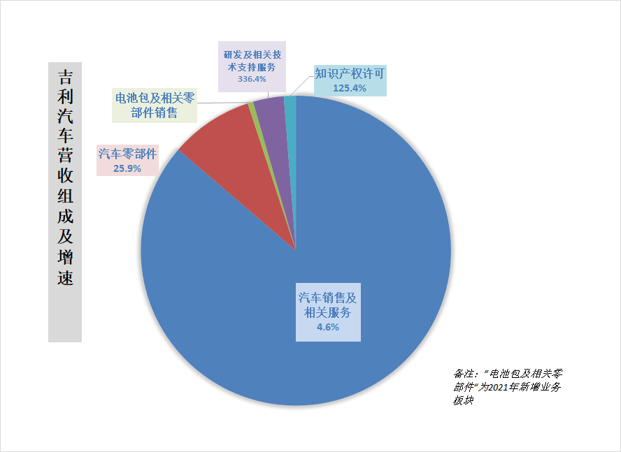 2021年,汽车零部件为吉利汽车提供了88亿的营收,研发及相关技术支持服务、知识产权分别获得336.4%、125.4%的收入增速。