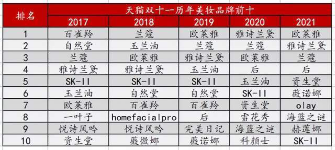 以美妆品牌为例,2017年在天猫双11美妆榜单上的新品牌,4年后都退出了榜单,比如“一叶子”。