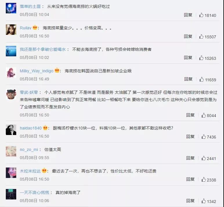 究其原因不过是,当消费者对海底捞服务失去了新鲜感之后,海底捞的缺点就一一凸显出来,尤其是一直以来被海底捞忽视的产品力,让大家普遍认为海底捞性价比不高。