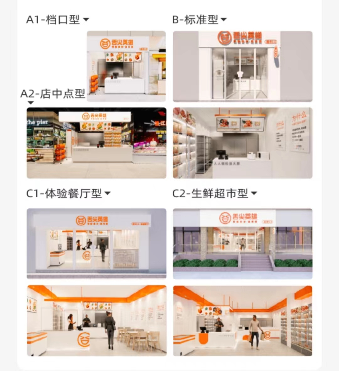 在APP上,“舌尖英雄”发布了一则合作伙伴计划。其中,就介绍到其目前的门店类型。“舌尖英雄”的门店面积在8~60平方米,其中A类门店包括店中店、档口店,最小仅需8平米,投资金额3万起;B类标准店在20平方米左右,投资金额5万起;C类门店则包括体验餐厅型、生鲜超市型,面积在60平米以上,投资金额11万起。