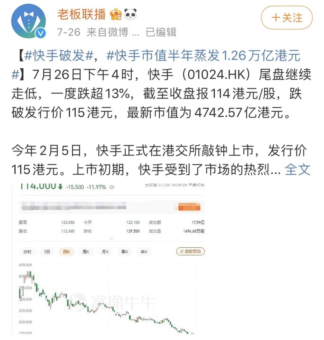 随即,这条消息引发了市场巨大恐慌,快手股价当天暴跌11.97%,报收114港元,市值蒸发645亿港元。