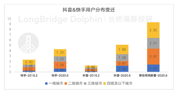 从抖快2018年以及2020年上半年(抖音2020.2;快手2020.6)的用户城市分布来看,近两年抖音加速了下沉市场(三四线以下城市)的渗入,而快手则主要发力一二线城市。
