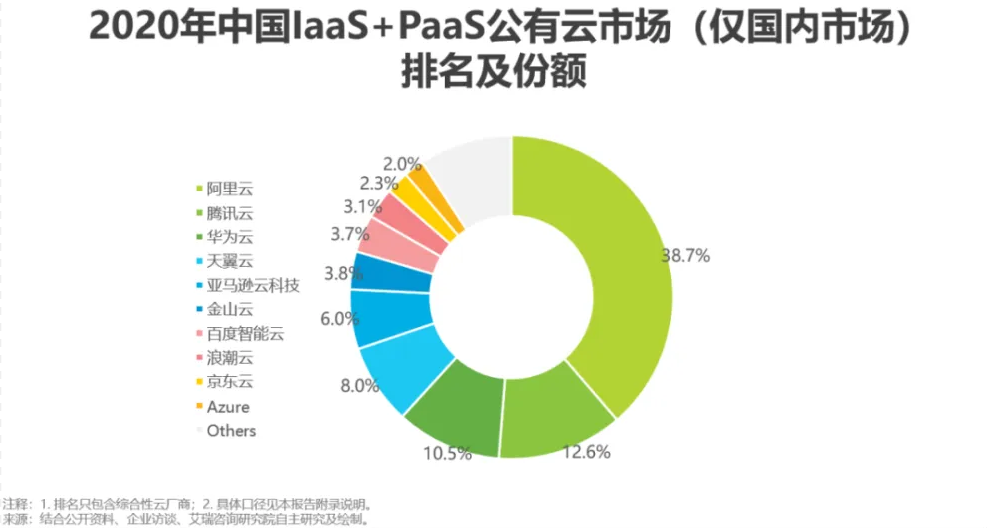 从一些调研机构统计出来的数据来看,2020年,腾讯云在国内“IaaS+PaaS”公有云市场份额为12.6%,位居第二,相比第三的华为云高2.1%(艾瑞咨询)。