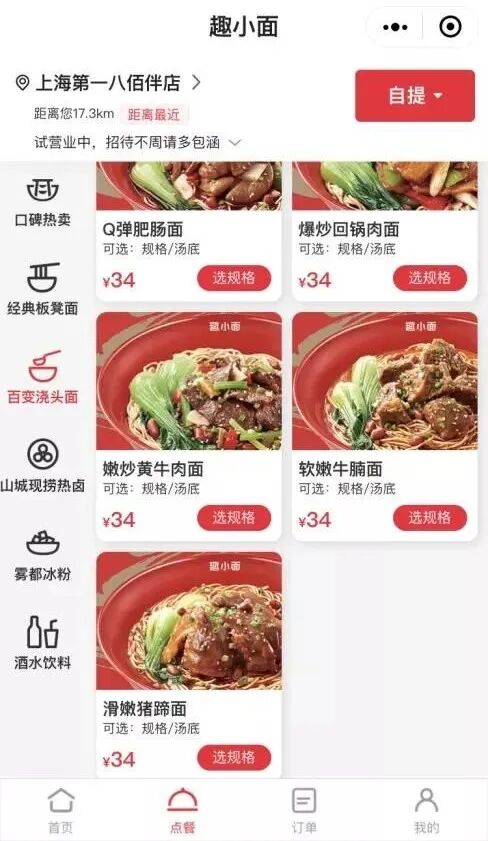根据品牌小程序显示,趣小面在菜单中细分出了包含经典板凳面、百变浇头面、现捞热卤和雾都冰粉等四条产品线,共计30个SKU。