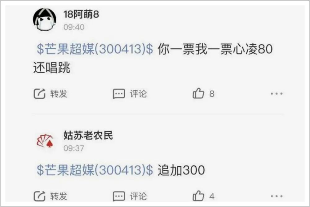 随之而来的,是粉丝疯狂的打榜行为。有媒体报道,王心凌的中年男粉甚至买爆了芒果超媒股票。