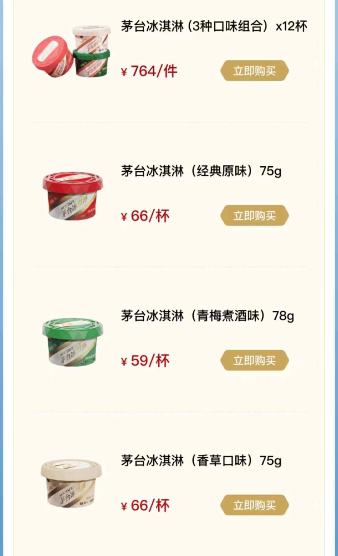 3款茅台冰淇淋中,两款售价为66元一杯,另一款售价59元。据了解,这3款茅台冰淇淋在“i茅台”App上线售卖,每一笔订单(12杯以下)配送费35元。
