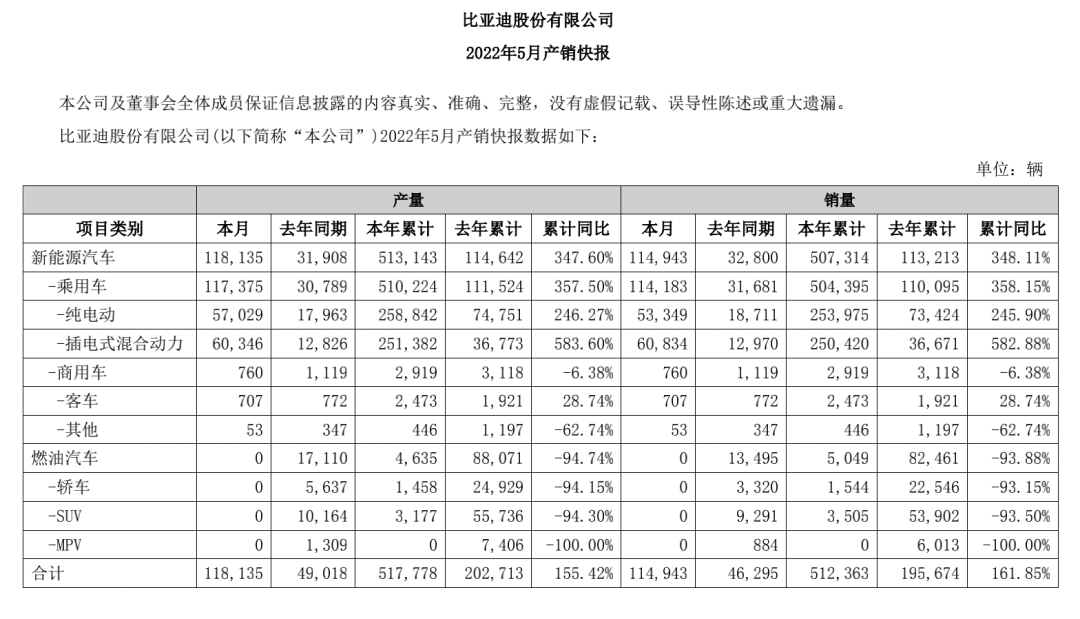 从总体市场来看,过去三个月,比亚迪的销量均突破了 10万辆。根据其最新发布的5月产销快报显示,比亚迪5月新能源汽车产量达11.81万辆,环比增长近10%,同比增长270.24%。其中DM混动车型销量6.08万辆,EV纯电车型销量为5.33万辆。