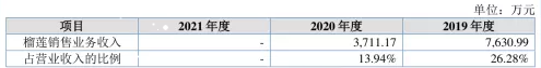 根据资料,2019年,田野股份榴莲销售业务收入7630.99万元,占营业收入比例为26.28%,2020年榴莲销售业务收入减半,仅占营业收入的13.94%,而到了2021年,已无榴莲销售业务收入。