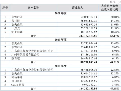 2020年,奈雪的茶一跃成为田野股份的第二大客户,到了2021年,前五大客户已经被新式茶饮占据了四席,其中包括奈雪的茶、茶百道、一点点和沪上阿姨四个连锁茶饮品牌,在总营收的占比分别为20.04%、14.38%、11.58%和10.49%。