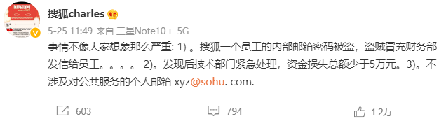 一周后,搜狐CEO张朝阳在微博回应说,起因是内部员工账号被盗,冒充财务发邮件诈骗,不过损失没超过5万元。