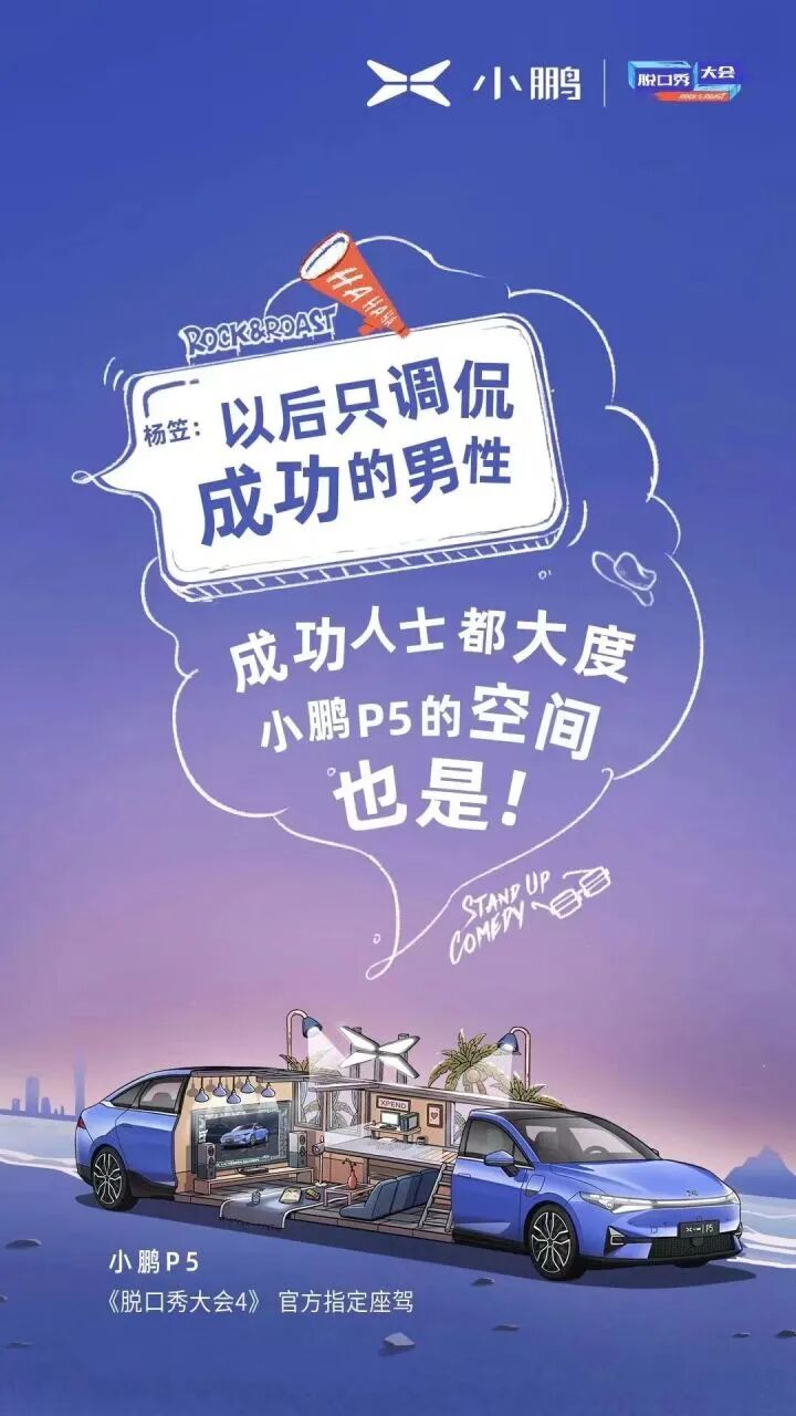 小鹏P5作为一辆紧凑型轿车,为了突出自己的空间优势,打出广告语“成功男士都大度,小鹏P5的空间也是!”而代言人则是此前因为“普信男”言论成为男性众矢之的的杨笠。
