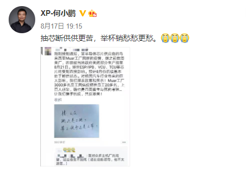 当晚,何小鹏在微博上写上了一首“诗”:抽芯断供供更苦,举杯消愁愁更愁。后面还附上了三个大哭的emoji表情。