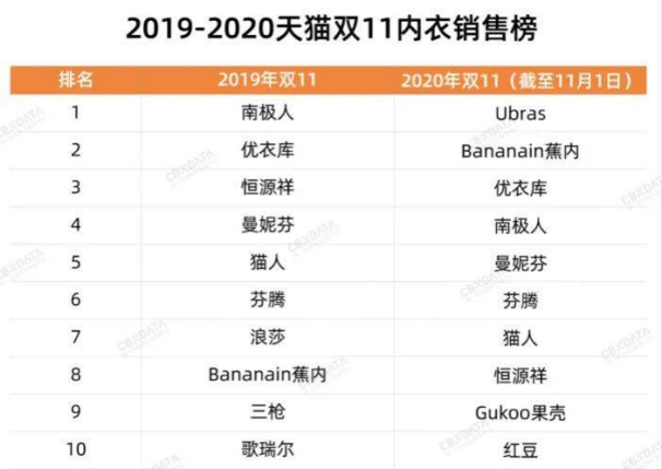 一众新锐品牌,打破过往的“钢圈内衣”设计,通过无钢圈、无尺码弯道超车,最终实现了后来居上。据公开资料,2019年天猫双11内衣销售榜上,前五名的品牌分别为南极人、优衣库、恒源祥、曼妮芬、猫人,均为传统内衣品牌,可见在当时钢圈内衣仍是市场的主流。
