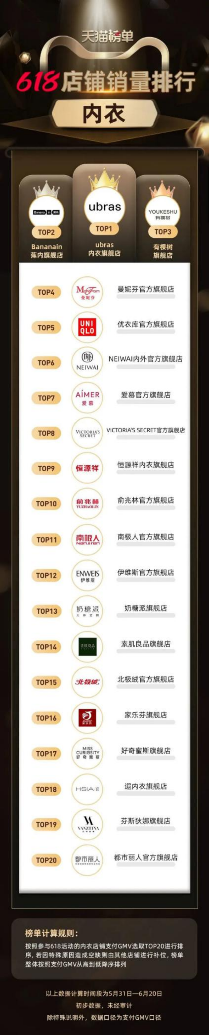 今年618天猫内衣品类的销量排行榜中,新锐内衣品牌仍然抢跑在前,位列前三的品牌分别为蕉内、ubras、有棵树,均是新锐内衣品牌。
